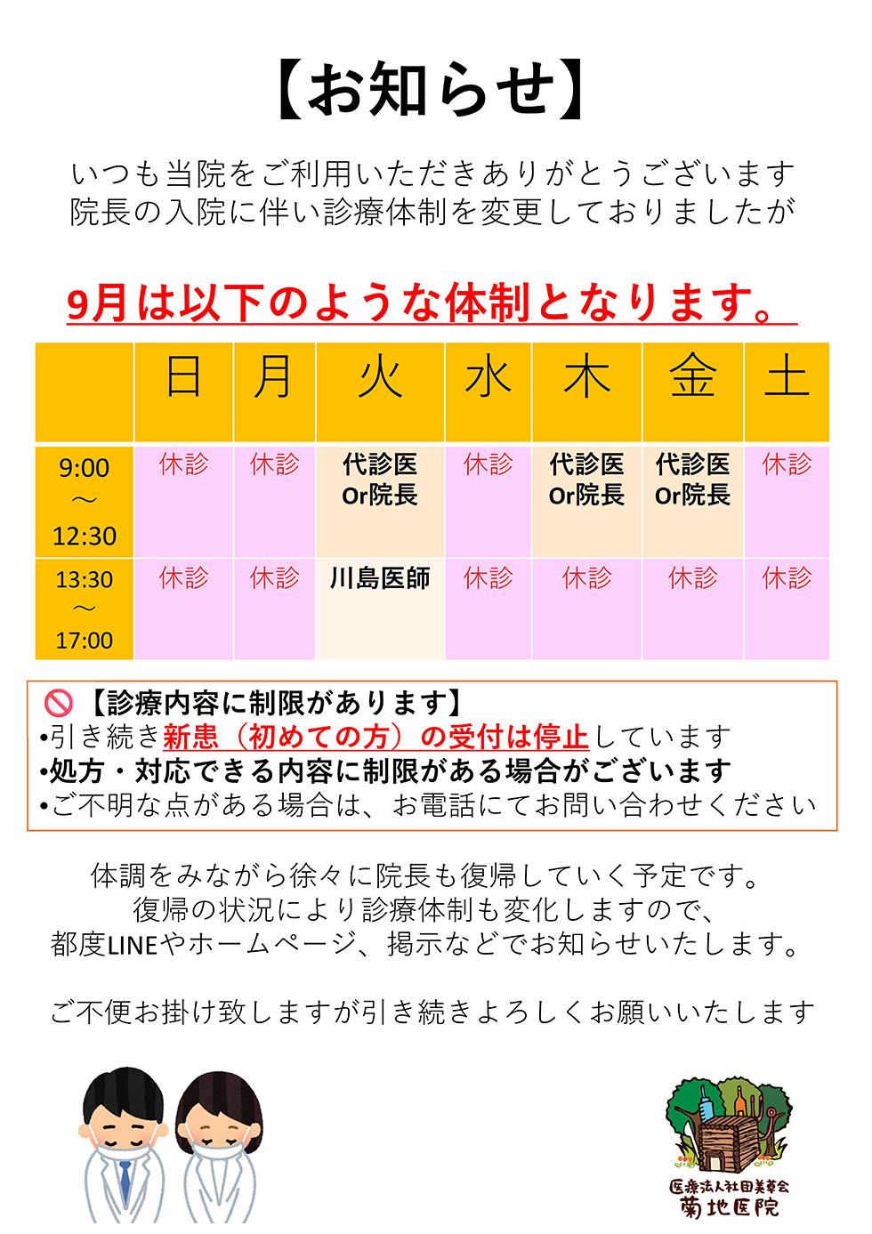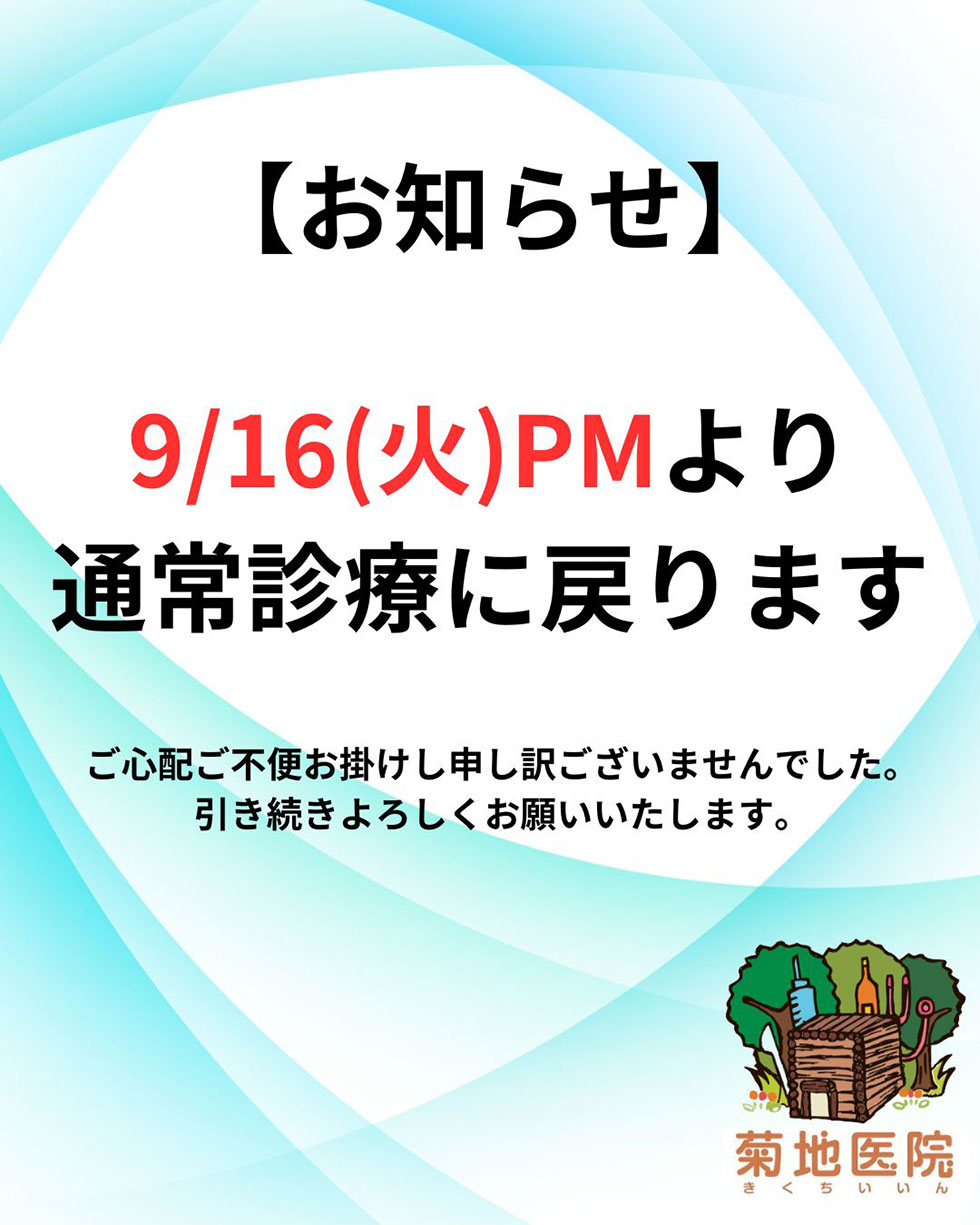 [大切なお知らせ] 9月17日(水)より通常診療を開始します