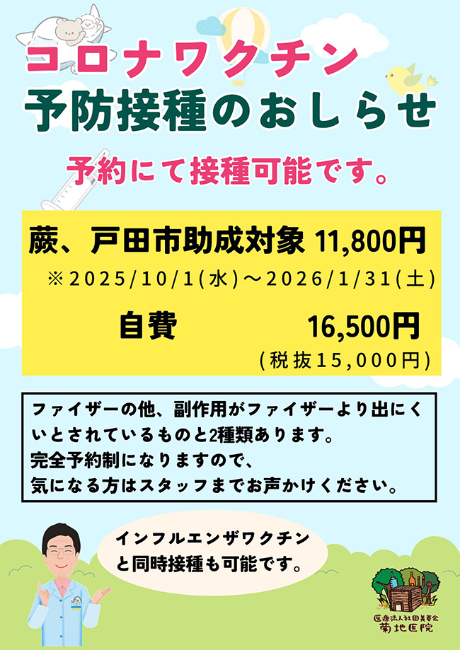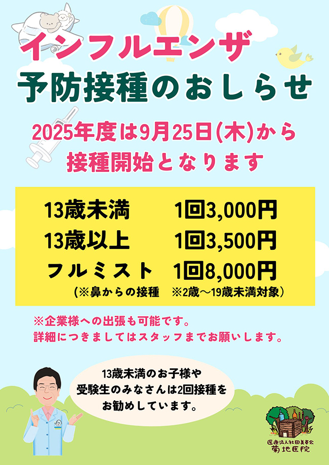 9月25日(木)よりインフルエンザワクチン接種を開始します。
